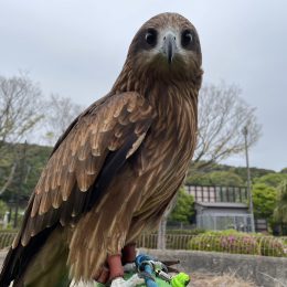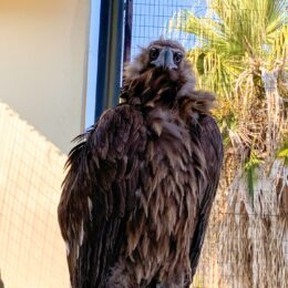 クロハゲワシはヨーロッパ、中央アジア、中国などに分布する鳥ですが、森きららで暮らしているワカコ(♀)は、迷い鳥として長崎県の離島である五島で保護されたという珍しい経歴の持ち主です。