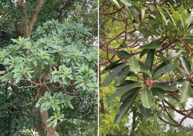 ・長さ5~10cmの倒披針形、皮質で光沢があり、枝葉に集まってオリーブに似たような実がなる