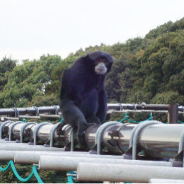 合趾猿是長臂猿中體型最大的,全身呈黑色。主要生活在馬來半島、蘇門答臘島等熱帶雨林地區。合趾猿也被稱為「會唱歌的猴子」,是因為當它們發出叫聲時,就像在唱歌一樣。森閃閃裡現在住著一個大家族,夫妻關係良好的KARI(♂)和KURO(♀)和它們的3個孩子。天氣不錯的日子裡,有機會看到它們在13m高的雲梯上戲耍的樣子,還可以觀察它們在開放的小島上悠閒自在的姿態。