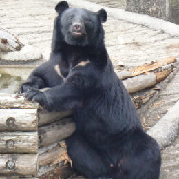 毛色呈黑色,胸前有白斑是日本黑熊的特徵。生活在山林裡,喜歡吃樹的果實和昆蟲等等。