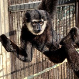 雌雄都有像眉毛一樣的白色紋路,雄性黑掌長臂猿下巴部分也有白色的毛。與白掌長臂猿不同的是,它們的手指是黑色的,只有臉部周圍是白色的。森閃閃裡生活著雄性的Itou,它比較膽小,去看的時候請保持安靜。