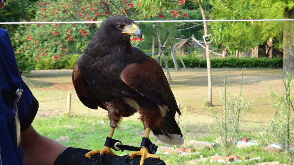 近距離觀看哈里斯鷹展開龐大翅膀翱翔的樣子,飼養員會對其能力及性格進行介紹。